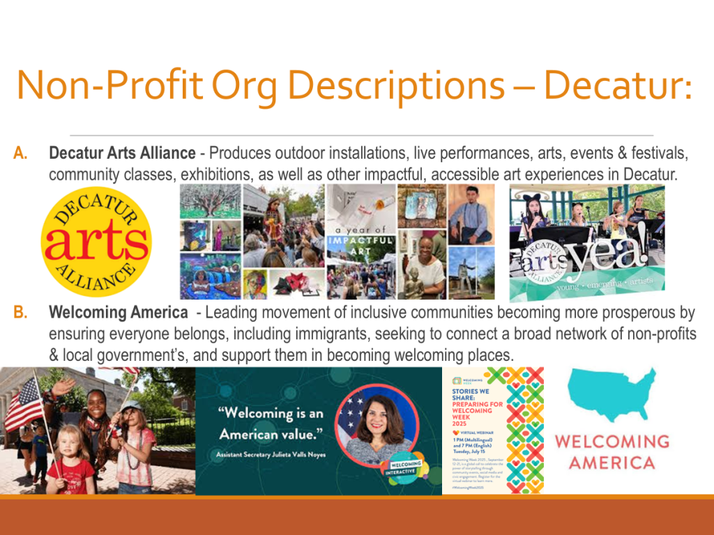 In context of DHS’ Community Connections, the following, embedded file illustrates the Decatur High School’s geographical context and relevant, local non-profit organizations, as well as established, or potential future relationships: